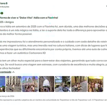 ”Minha primeira viagem internacional foi com a Flavinha Te Leva, só com mulheres, e foi simplesmente incrível. Me senti segura, acolhida e com suporte total do início ao fim!.”